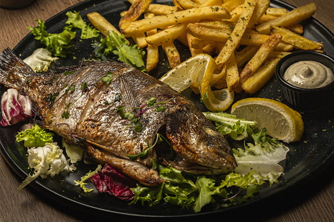200–250g fried cod with a touch of lemon and garnish