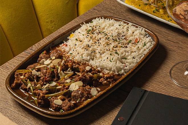 Sautéed beef tenderloin in homemade spicy sauce with Japanese onion and sliced almonds served with basmati rice