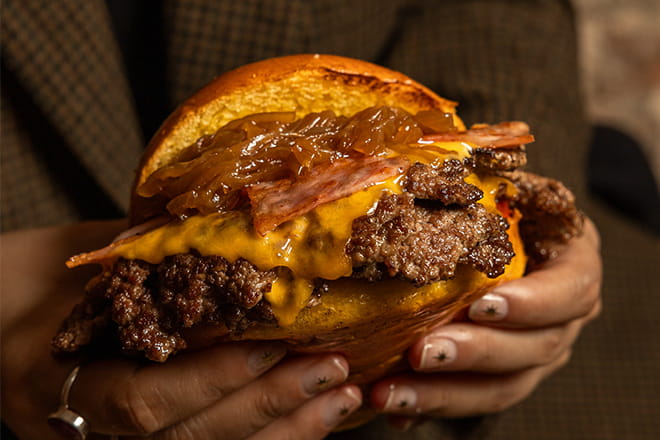 Triple smashed beef with triple cheddar cheese, turkey bacon, mixed leaves, tomato, caramelized onion and homemade sauce served with fries
