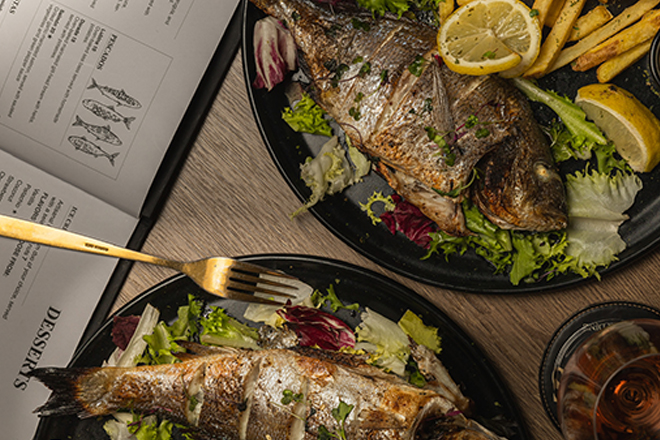 Lubina de 250g entera marinada con especias al horno acompañado de patatas al horno