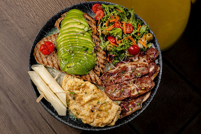 Tostada, bacon de pavo, omelette, ensalada, tomate cherry, queso manchego, mermelada, aguacate queso crema y mantequilla