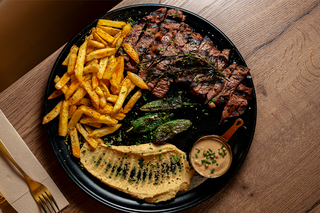 250–300g marinated steak with homemade herb butter topping served with green pepper fusion sauce and fries