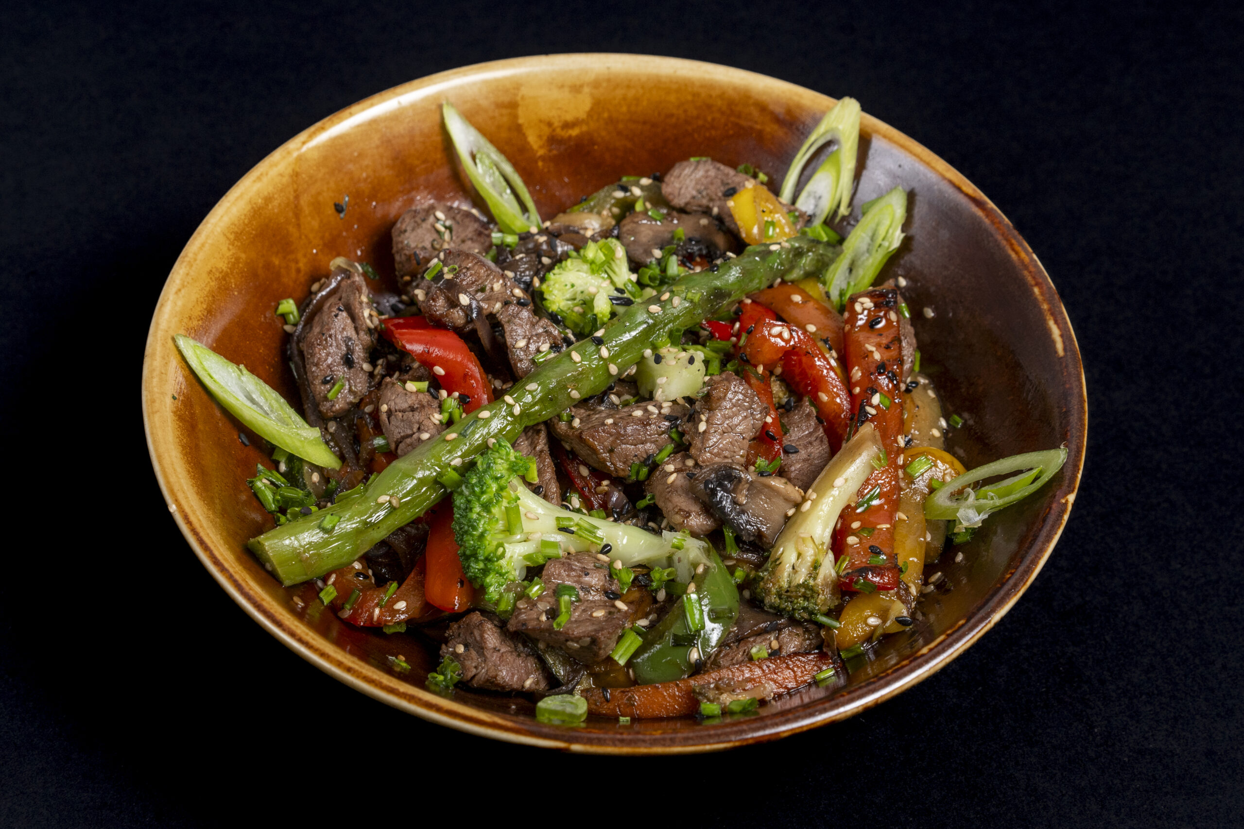Stir-fried tenderloin, mixed vegetables with sesame oil and soy sauce