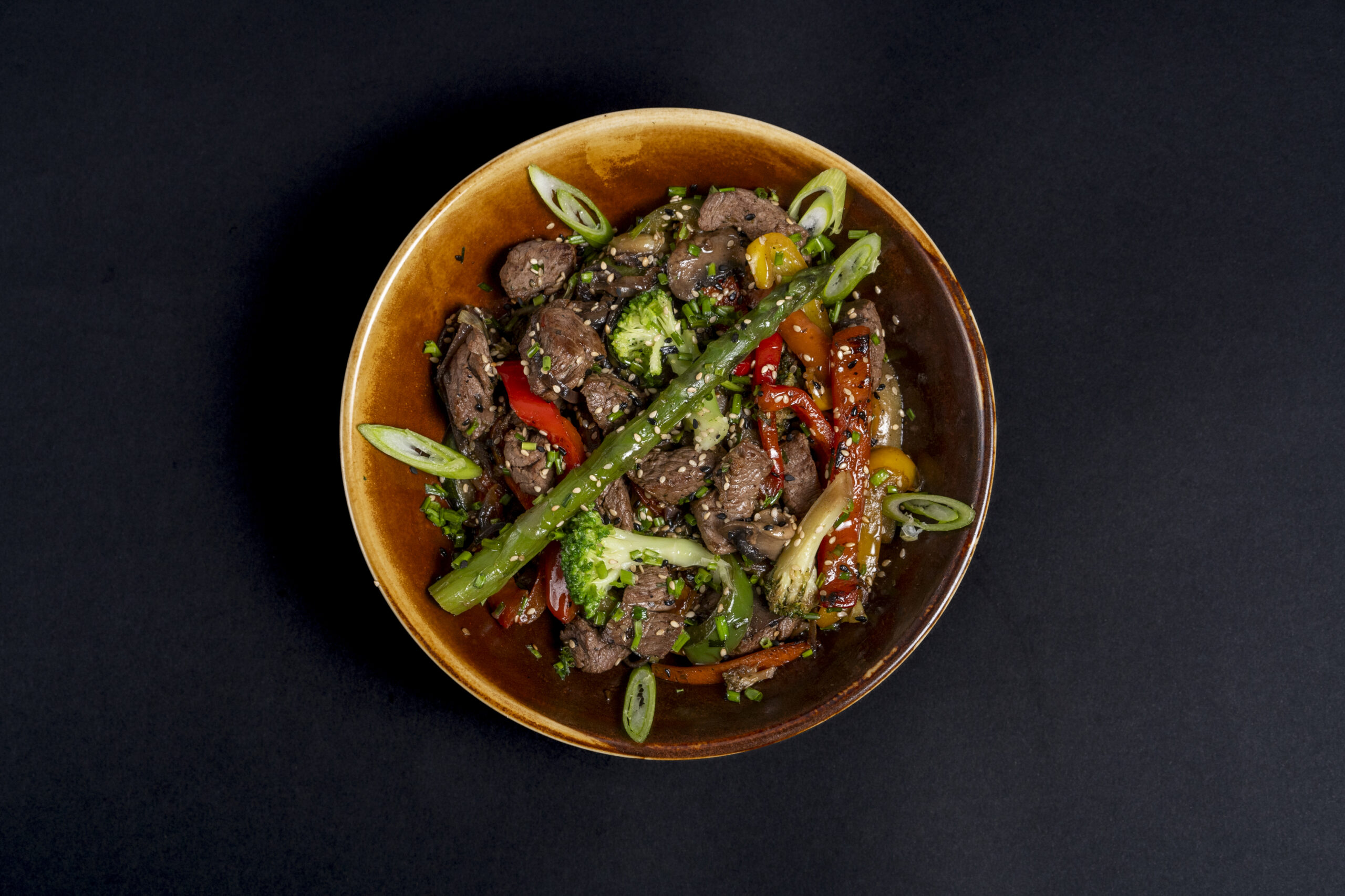 Salteado de ternera con variado de verduras salteadas con toque de aceite de sésamo y salsa soja