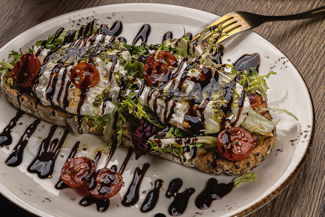 Toast, arugula, burrata cheese, cherry tomatoes, balsamic and green sauce