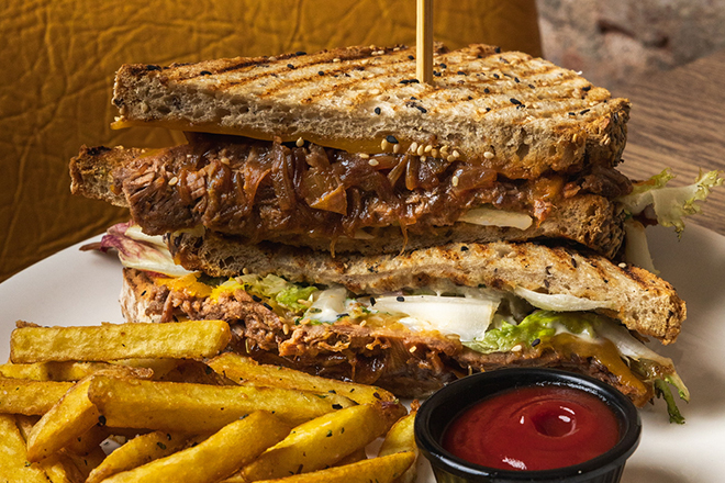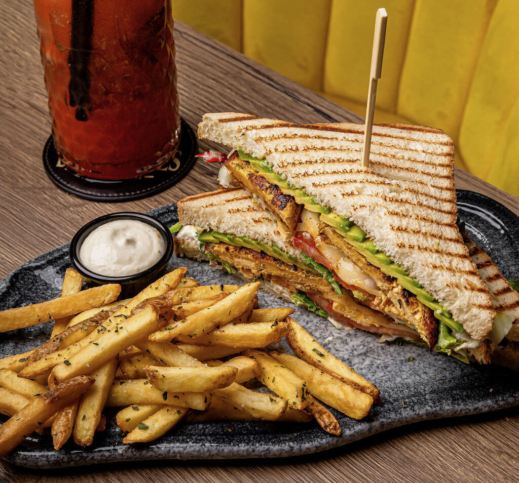 Grilled chicken, mayonnaise, fried egg, cheese, avocado, tomato and mixed leaves served with