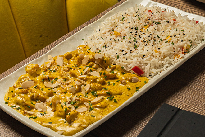 Pollo salteado con especias de la casa, acompañado de arroz basmati