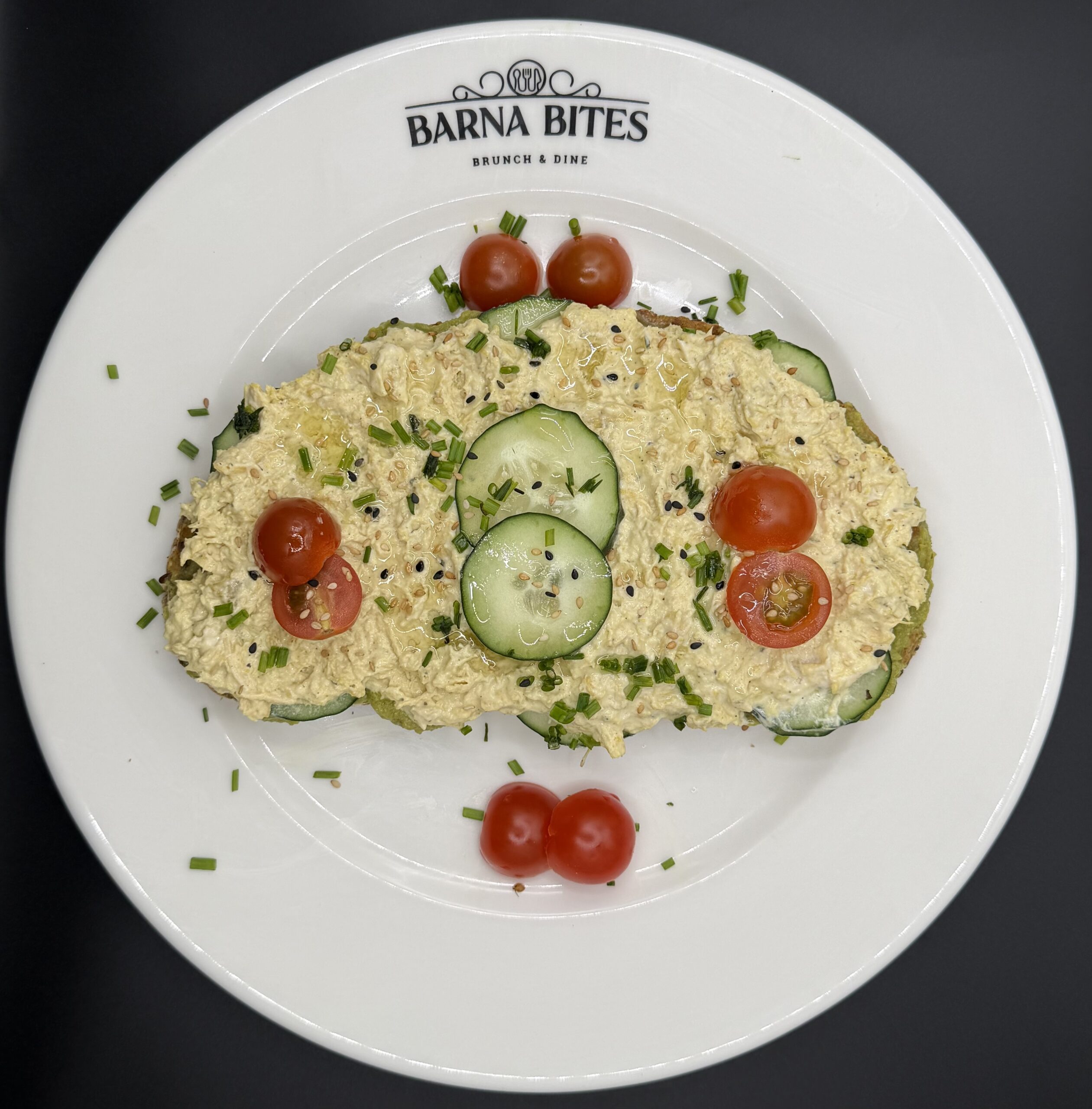 Toast with guacamole, cucumber, tomato and chicken marinated in white sauce