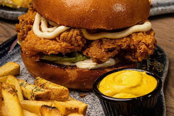 Pollo crujiente, lechuga, tomate, queso cheddar, cebolla, salsa casera y patatas fritas