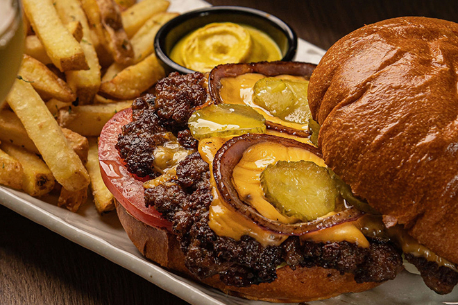Ternera picada especial de la casa, lechuga, tomate, cebolla, pepinillos, queso cheddar y salsa casera, acompañado de patatas fritas