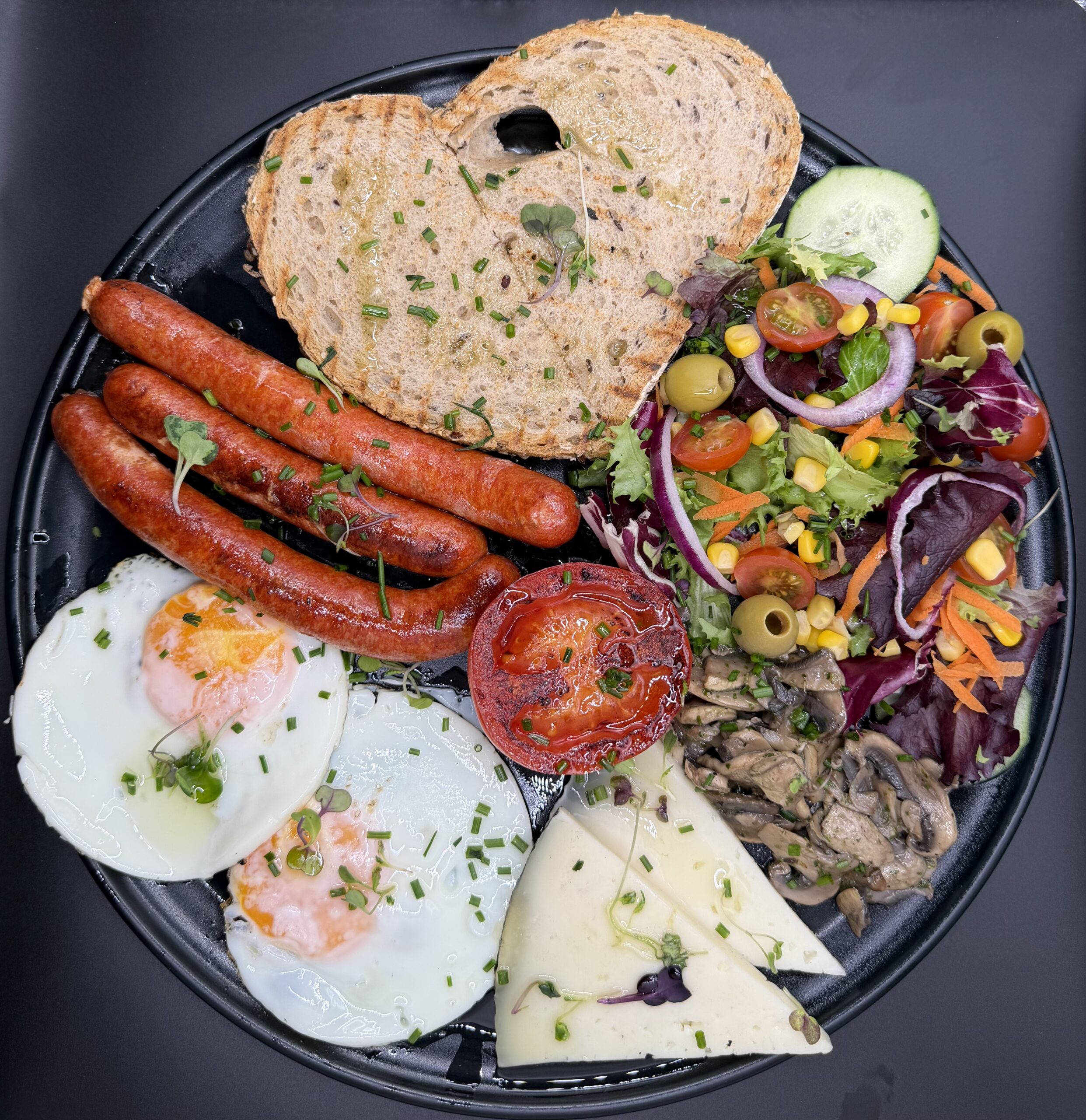 Salchichas de pollo, setas, pan tostado, huevo frito, tomate cherry, queso y ensalada