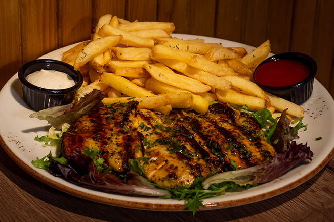 Pechuga de pollo marinado con especias a la brasa acompañado de patatas fritas y salsa casera de pimientos