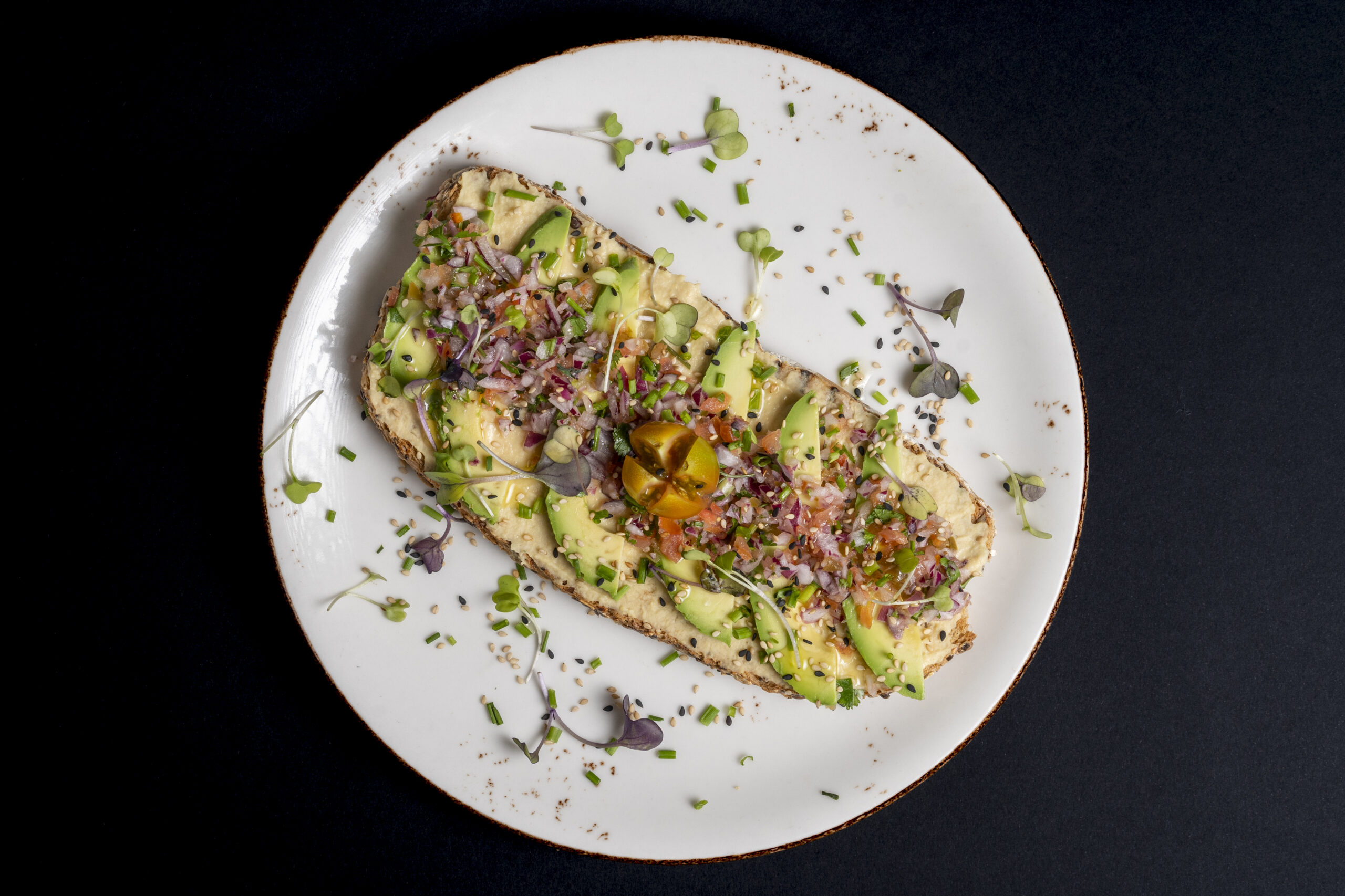Tostada con hummus, aguacate, pico de gallo y semillas de sésamo