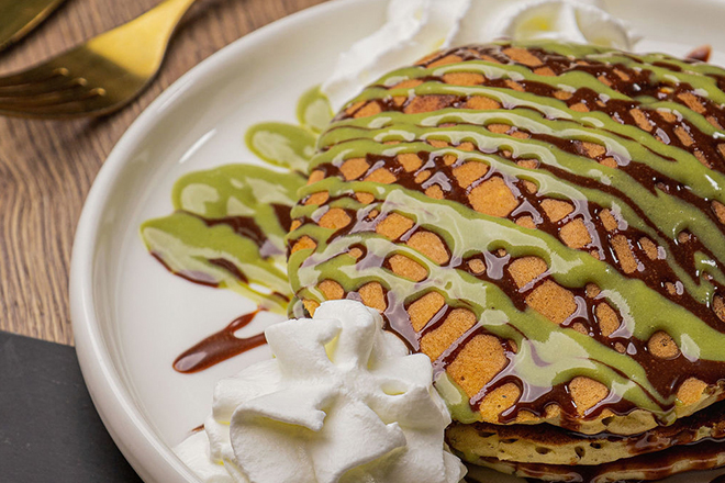 Pancakes with homemade Nutella, pistachio cream and cream