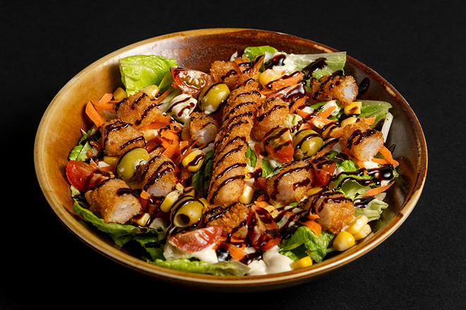 Fresh lettuce, cherry tomatoes, carrot, corn, avocado and fried prawns with homemade sauce and olive oil