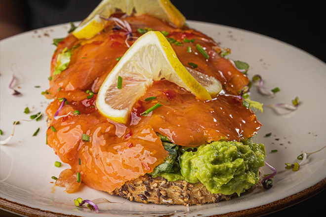 Toast with guacamole, salad, fresh chives, smoked salmon marinated in homemade sauce and a touch of lemon