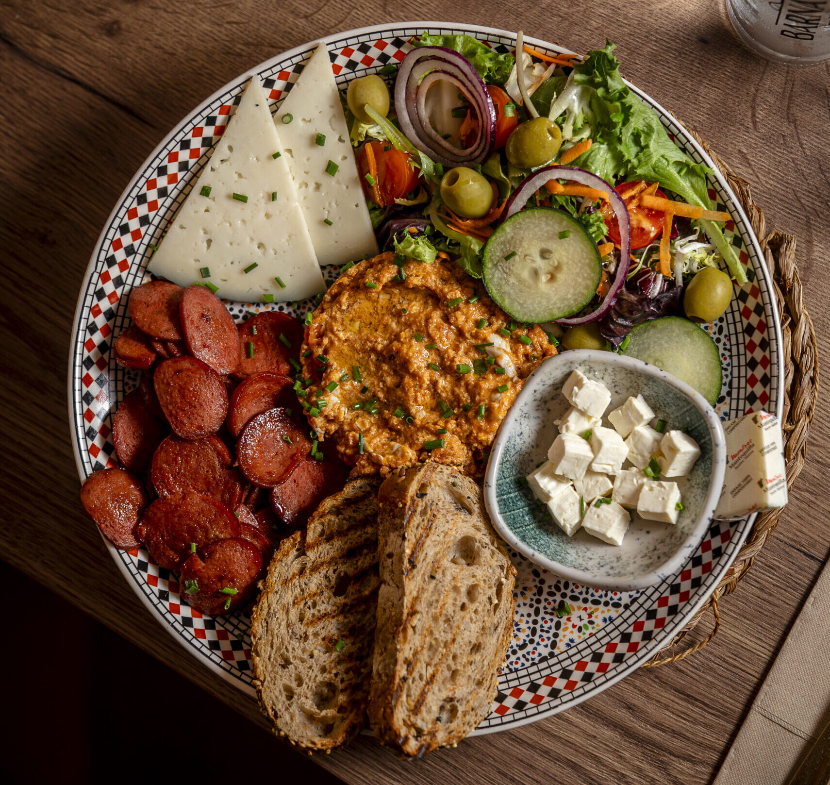 Menemen (huevos revueltos con salsa de tomate natural), sucuk (salchicha turca) ensalada con feta, miel y pan